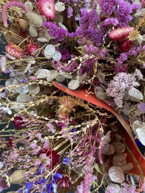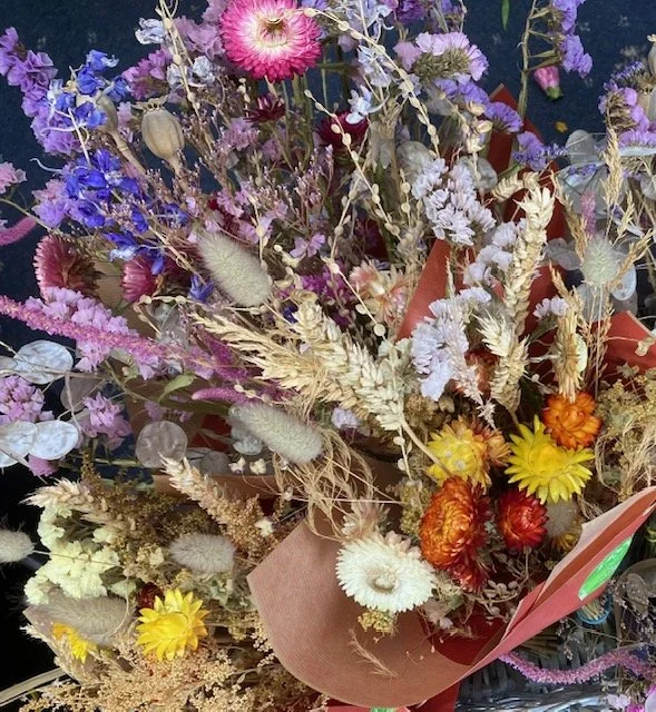 We grow several crops of flowers specifically for drying and love to offer dried flower bouquets and wreaths just as our fresh flower season is slowing down.